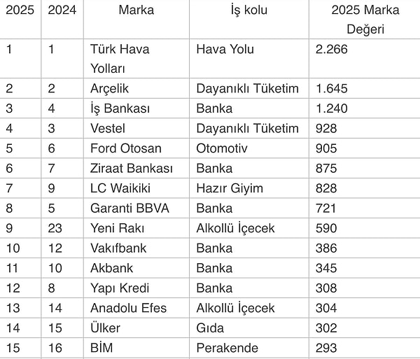 THY, 2 milyar 266 milyon dolarlık marka kıymetiyle son yıllarda olduğu üzere tekrar birinci sırada yer aldı.