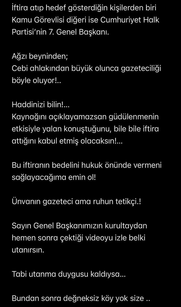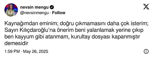 ‘Kaynağımdan eminim; gerçek çıkmamasını daha çok isterim; Sayın Kılıçdaroğlu’na önerim beni yalanlamak yerine çıkıp ben kayyum üzere atanmam, kurultay belgesi kapanmıştır demesidir.‘