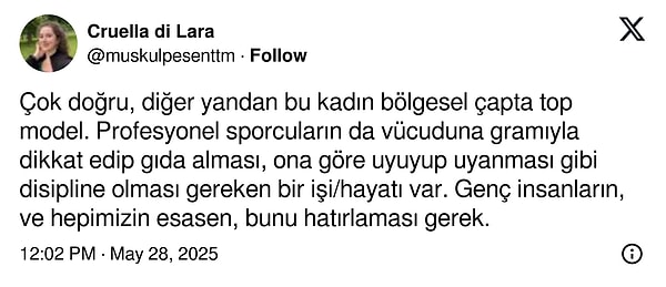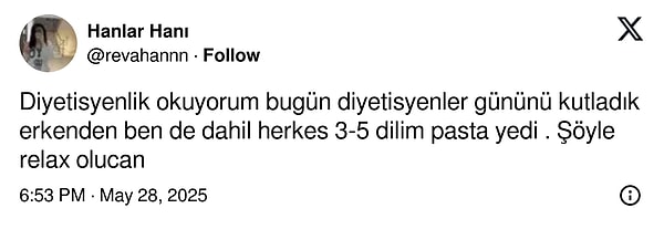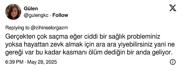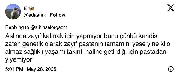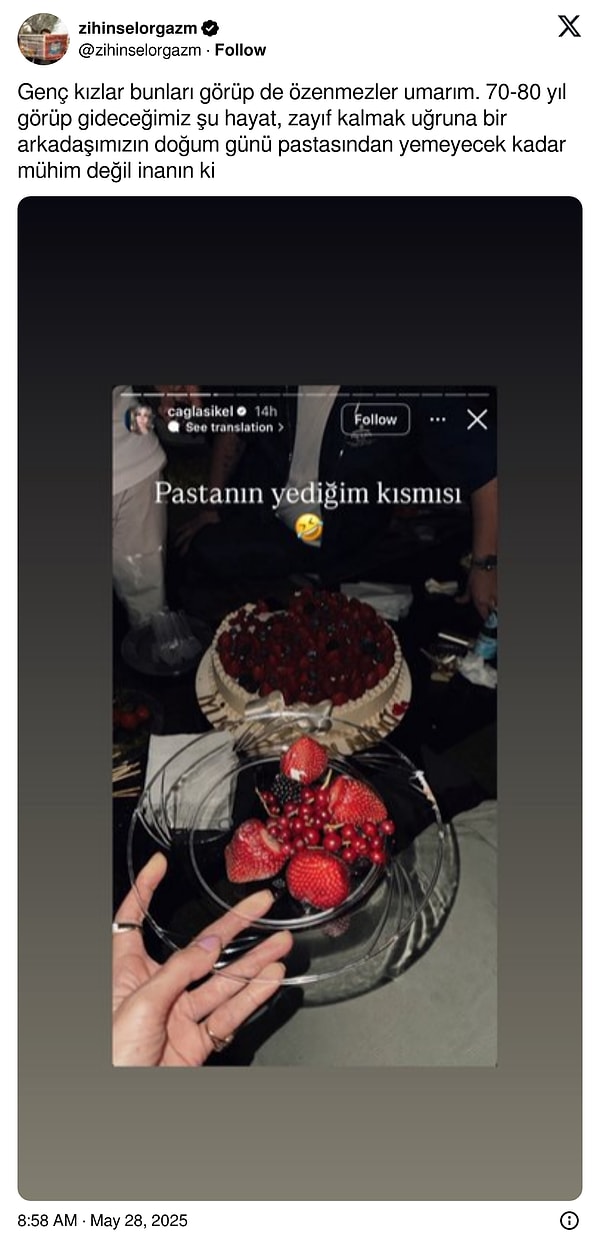 Bir X kullanıcısının “70-80 yıl görüp gideceğimiz şu hayat, zayıf kalmak uğruna bir arkadaşımızın doğum günü pastasından yemeyecek kadar önemli değil inanın ki” tabirleri gündem oldu.