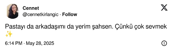 Arkadaşının doğum günü pastasından yalnızca meyveleri yemeyi tercih eden Şıkel’in ‘Pastanın yediğim kısmı’ notlu paylaşımı gündeme yerleşti.
