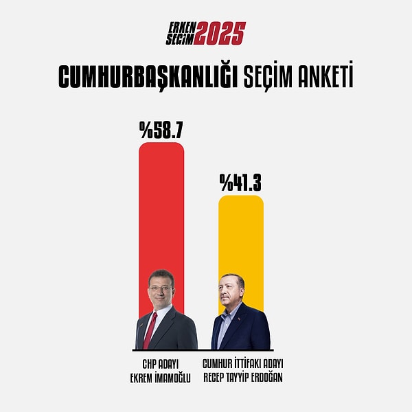 2 adaylı yapılan seçim anketinde Ekrem İmamoğlu oyların yüzde 58,7’sini alırken, Cumhurbaşkanı Recep Tayyip Erdoğan’ın oy oranı ise yüzde 41,3 oldu.