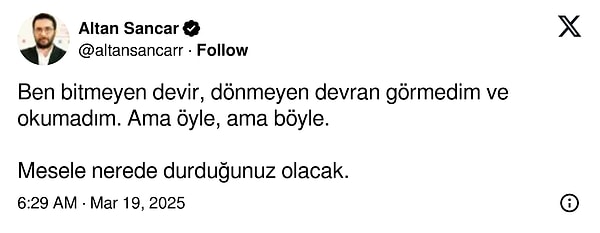 Sancar, 19 Mart 2025 günü İstanbul Büyükşehir Belediye Başkanı Ekrem İmamoğlu’nun gözaltına alınması ve İBB’ye başlatılan soruşturmaların çabucak akabinde bir paylaşım yaptı. Sancar, paylaşımında ‘Ben bitmeyen zaman, dönmeyen devran görmedim ve okumadım. Ancak o denli, lakin bu türlü. Sorun nerede durduğunuz olacak.’ dedi.