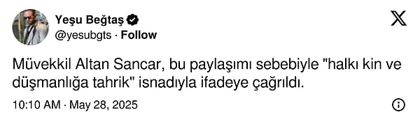 Gazeteci Altan Sancar X (Twitter) hesabından yaptığı bir paylaşım nedeniyle tabire çağrıldı. Avukat Yeşu Beğtaş, ‘Müvekkil Altan Sancar, bu paylaşımı sebebiyle ‘halkı kin ve düşmanlığa tahrik’ isnadıyla söze çağrıldı’ açıklamasını yaptı.