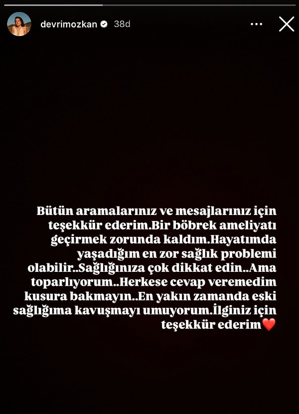 Devrim Özkan “Bütün aramalarınız ve iletileriniz için teşekkür ederim. Bir böbrek ameliyatı geçirmek zorunda kaldım. Hayatımda yaşadığım en sıkıntı sıhhat sorunu olabilir. Sıhhatinize çok dikkat edin. Lakin toparlıyorum. Herkese karşılık veremedim, kusura bakmayın. En yakın vakitte eski sıhhatime kavuşmayı umuyorum. İlginiz için teşekkür ederim.”  ifadeleriyle sıhhat durumu hakkında bilgilendirdi.