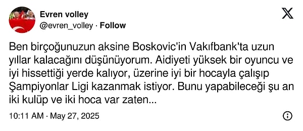 2015-2016 döneminden bu yana Eczacıbaşı’nın takımında bulunan voleybol dünyasının yıldız isimlerinden Boskovic, kendi ismine tarihi başarılara imza attığı mesleğine nokta koyma kararı almıştı. Dönem ortasında Vakıfbank ile anlaştığı tabir edilen 28 yaşındaki pasör çaprazı için beklenen resmi açıklama geldi, transferin duyurusu büyük dikkat çekti.