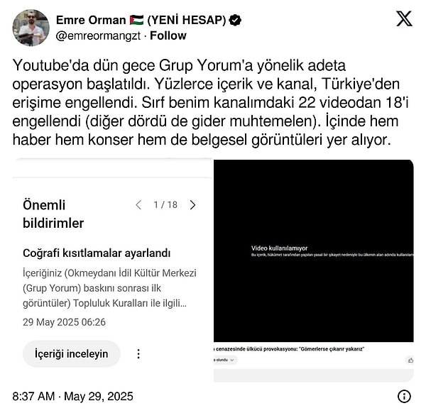 ‘Youtube’da dün gece Küme Yorum’a yönelik adeta operasyon başlatıldı. Yüzlerce içerik ve kanal, Türkiye’den erişime engellendi. Sadece benim kanalımdaki 22 görüntüden 18’i engellendi (diğer dördü de masraf muhtemelen). İçinde hem haber hem konser hem de belgesel imgeleri yer alıyor.’