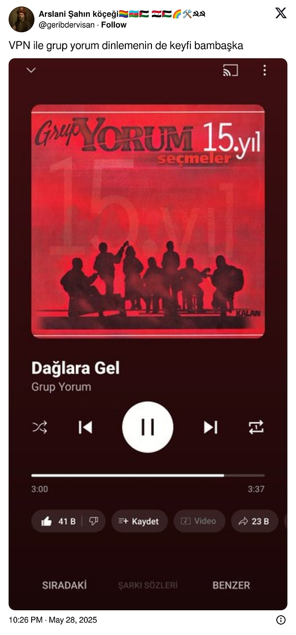 ‘Grup Yorum’u toplumsal medyada yasaklamak? Bu aklı size kim verdi? Bölüm Spotify, Youtube evresi de Küme Yorum bu zamanın müzisyeni mi? Siz Yorum’u üç beş drill rapçi mi sandınız? Küme Yorum sokakta devrimci hareketle var olmuş onla varlığını sürdürecek her periyodun, devrimci sanatıdır.’