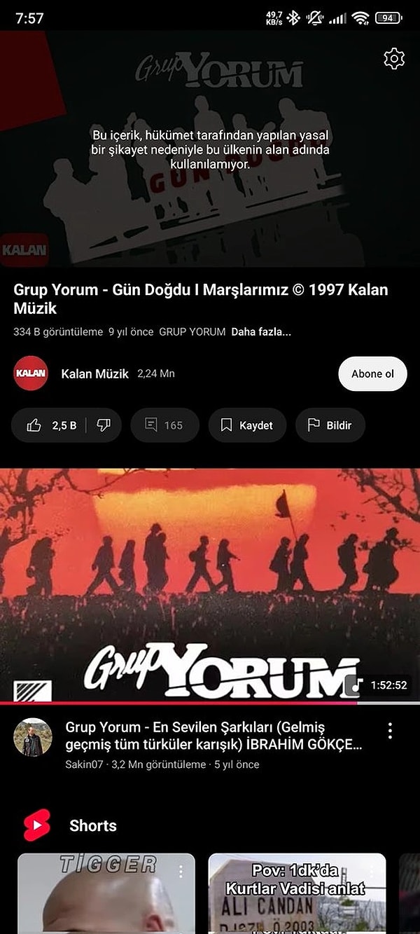Gruba ilişkin 2 kanal engellendi, ferdî olarak paylaşılan görüntülere da ulaşılamıyor. Küme Yorum’a ilişkin “halklarınsesiyiz” ve “grupyorumtv” isimli kanallar kapatılırken, Kalan Müzik tarafından paylaşılan müziklere da erişim engeli getirildi. YouTube erişim pürüzüne sebep olarak, “Bu içerik, hükümet tarafından yapılan yasal bir şikayet nedeniyle bu ülkenin alan isminde kullanılmıyor” açıklaması yaptı.