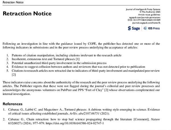 • Daha sonra geri çekilmiş birtakım araştırma makalelerine yapılan atıflar. (Bu atıfların, üçüncü taraf müdahalesi ve manipüle edilmiş hakemlik süreçleriyle alakalı olduğu anlaşılmıştır.)