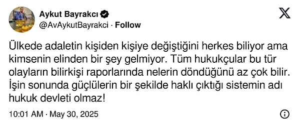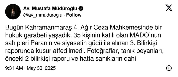 ‘Bugün Kahramanmaraş 4. Ağır Ceza Mahkemesinde bir hukuk garabeti yaşadık. 35 kişinin katili olan MADO’nun sahipleri Paranın ve siyasetin gücü ile alınan 3. Eksper raporunda kusur atfedilmedi. Fotoğraflar, şahit beyanları, evvelki 2 uzman raporu ve hatta sanıkların dahi kabul ettikleri tadilatlar 58 sayfalık raporda tamı tamına 3 cümle ile geçiştirilerek MADO’nun sahipleri hakkında kusur atfedilmedi ve isimli denetim kararları kaldırılarak duruşmalardan vareste tutuldu. Bugün mahkeme salonunda hukukun üstünlüğü olmazda üstünlerin hukukunun geçerli olduğunu lehlerine gelen birinci raporda isimli denetimlerinin kalkmasıyla anlamış olduk.’