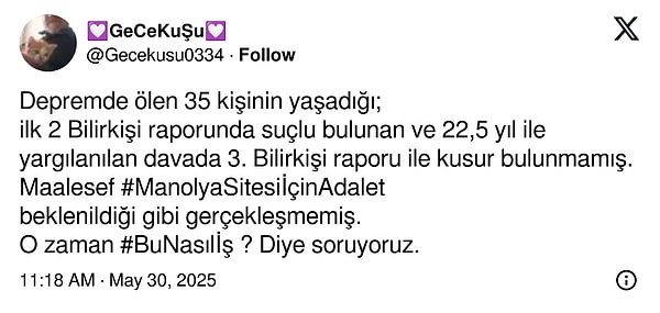Manolya Sitesi’nde annesi Tülay’ı kaybeden ve enkazdan yaralı olarak kurtulan avukat Mustafa Müdüroğlu, X hesabından açıklama yaptı: