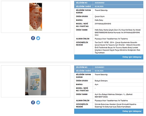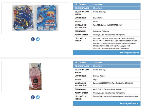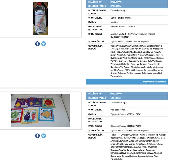 Ticaret Bakanlığı, sağlık açısından tehlike oluşturan kimi eserleri ‘Güvensiz Eser Bilgi Sistemi’ aracılığıyla kamuoyuyla paylaştı. Bakanlıktan yapılan açıklamada 6 eser ‘güvensiz’ olarak sınıflandırıldı ve piyasadan toplatılmasına karar verildi.