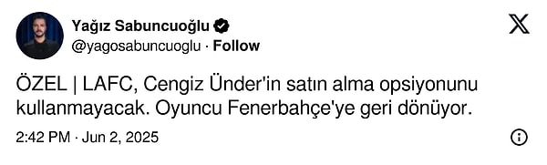 ‘LAFC, Cengiz Ünder’in satın alma opsiyonunu kullanmayacak. Oyuncu Fenerbahçe’ye geri dönüyor.’