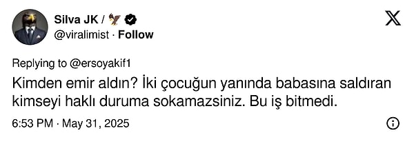 Kimden buyruk aldın? İki çocuğun yanında babasına saldıran kimseyi haklı duruma sokamazsiniz. Bu iş bitmedi.