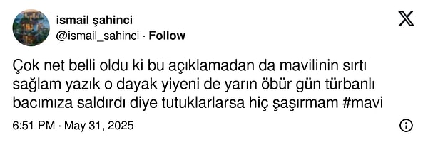 Çok net aşikâr oldu ki bu açıklamadan da mavilinin sırtı sağlam yazık o dayak yiyeni de yarın öbür gün türbanlı bacımıza saldırdı diye tutuklarlarsa hiç şaşırmam.