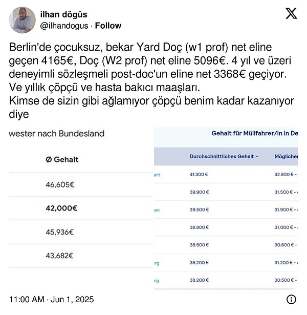 Almanya’daki doçent ve hasta bakıcı/çöpçü maaşlarını karşılaştıralım 👇🏻
