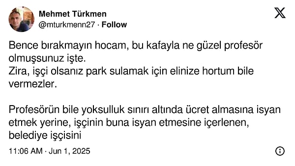 Profesörün bile yoksulluk sonu altında fiyat almasına isyan etmek yerine, emekçinin buna isyan etmesine içerlenen, belediye personelini yoksulluk hududunda bir fiyata bile layık görmeyen bir başla akademide işgal ettiğiniz yer gereğince büyük bir sorunmuş zati. Bari emekçilerden uzak durun.