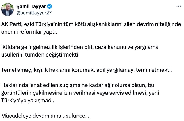 AKP’li Şamil Tayyar, toplumsal medya hesabından yaptığı açıklamada CHP’li belediyelere yönelik operasyon kapsamında gözaltına alınan belediye başkanı ve bürokratların görüntülerinin servis edilmesine reaksiyon gösterdi. Tayyar, manzaralar hakkında “Haklarında isnat edilen suçlama ne kadar ağır olursa olsun, bu manzaraların çekilmesine müsaade verilmesi yahut servis edilmesi, yeni Türkiye’ye yakışmadı” dedi.