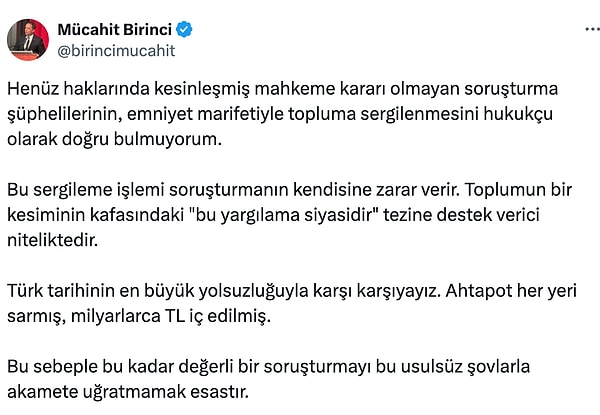 “Henüz haklarında mutlaklaşmış mahkeme kararı olmayan soruşturma şüphelilerinin, emniyet marifetiyle topluma sergilenmesini hukukçu olarak gerçek bulmuyorum.