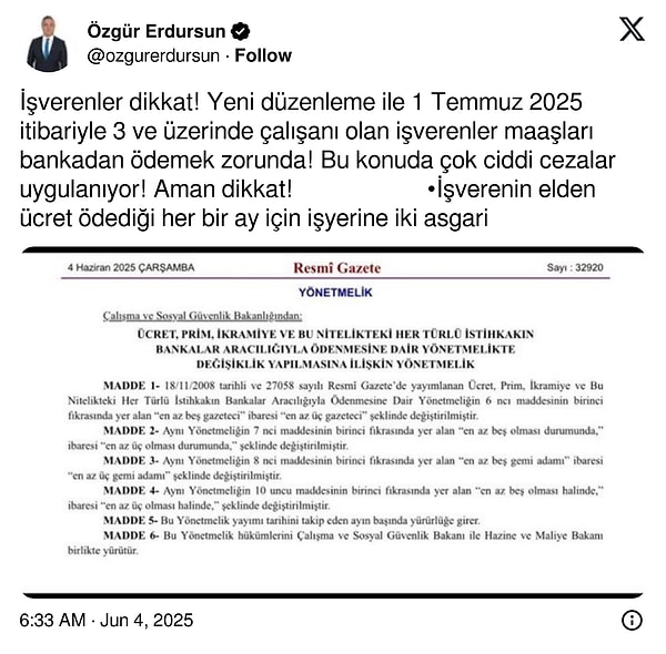 ‘Ücret, Prim, İkramiye ve Bu Nitelikteki Her Türlü İstihkakın Bankalar Aracılığıyla Ödenmesine Dair Yönetmelikte Değişiklik Yapılmasına Ait Yönetmelik’, Resmi Gazete’de yayımlandı. ‘En az 5 gazeteci’, ‘en az 5 gemi adamı’ ve ‘en az 5 işçi’ biçiminde uygulanan yönetmelik hususlarının kapsamı genişletildi.