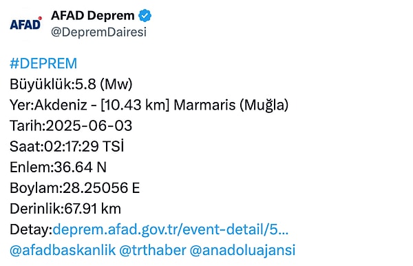 Afet ve Acil Durum İdaresi Başkanlığının (AFAD) internet sitesinde yer alan bilgiye nazaran, merkez üssü Akdeniz olan 5,8 büyüklüğünde sarsıntı kaydedildi. Muğla’nın Marmaris ilçesine 10,43 kilometre uzaklıktaki sarsıntının, 67,91 kilometre derinlikte meydana geldiği belirlendi. Sarsıntının hissedildiği bölgelerde kimi vatandaşlar, önlem maksatlı park ve bahçelere akın etti.