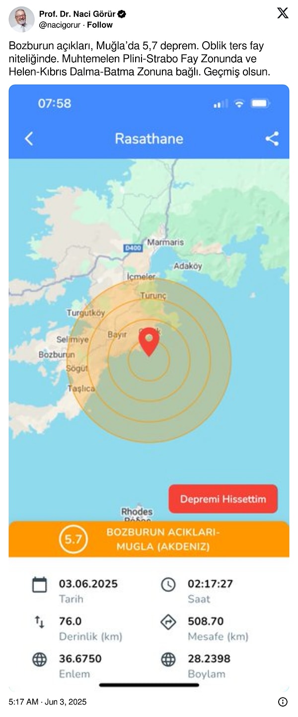 “Bozburun açıkları, Muğla’da 5,7 sarsıntı. Oblik aykırı fay niteliğinde. Muhtemelen Plini-Strabo Fay zonunda ve Helen-Kıbrıs Dalma-Batma zonuna bağlı. Geçmiş olsun.’