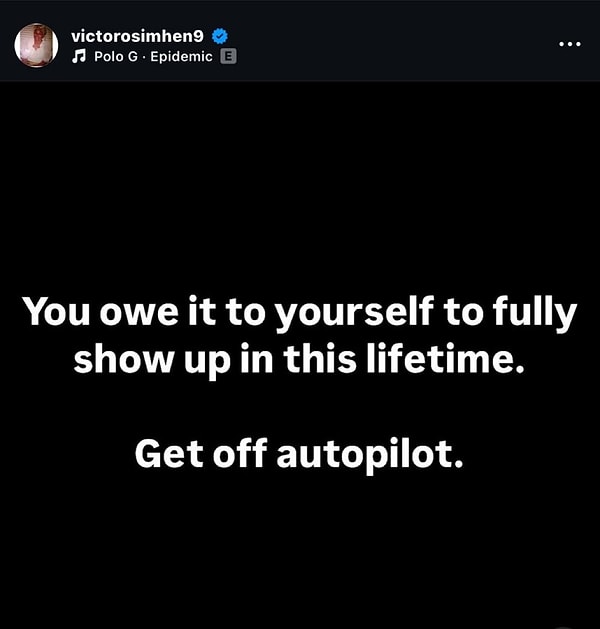 Türkiye’de transfer gündeminin ana konusu haline gelen Osimhen, Instagram hesabından yaptığı paylaşımda şu tabirleri kullandı: ‘Bu hayatta tam olarak ortaya çıkmayı kendinize borçlusunuz. Otomatik pilottan çıkın.’