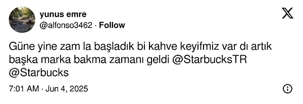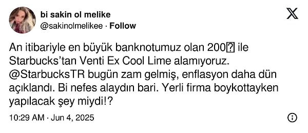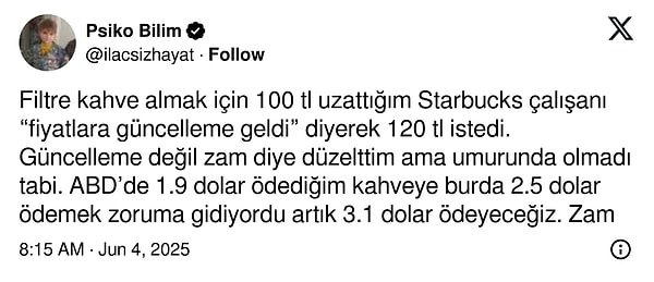 ‘Filtre kahve almak için 100 tl uzattığım Starbucks çalışanı ‘fiyatlara güncelleme geldi’ diyerek 120 tl istedi. Güncelleme değil artırım diye düzelttim fakat umurunda olmadı tabi. ABD’de 1.9 dolar ödediğim kahveye burda 2.5 dolar ödemek zoruma gidiyordu artık 3.1 dolar ödeyeceğiz. Artırım yapacak bir durum da yok üstelik.