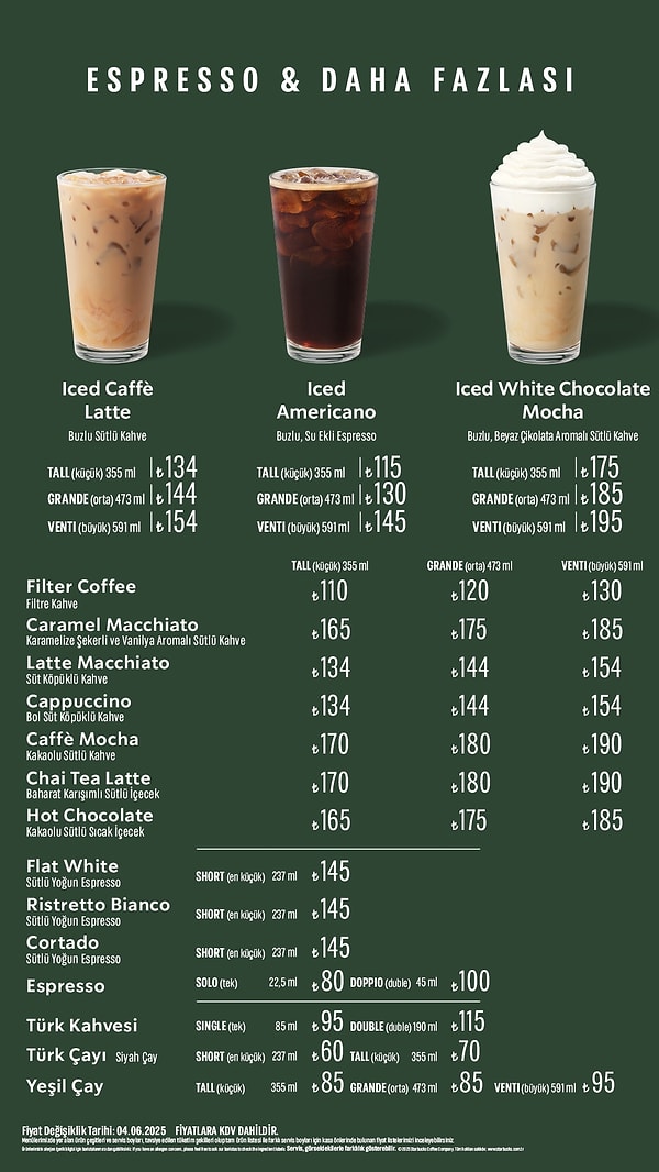Starbucks eserlerine yılın ikinci artırımı geldi. Toplumsal medyada paylaşılan fiyat listesinin 4 Haziran 2025’ten itibaren geçerli olacağı belirtildi. Starbucks’a yaklaşık yüzde 15 yapılan artırımla yeni fiyat listesi de aşikâr olmuş oldu.