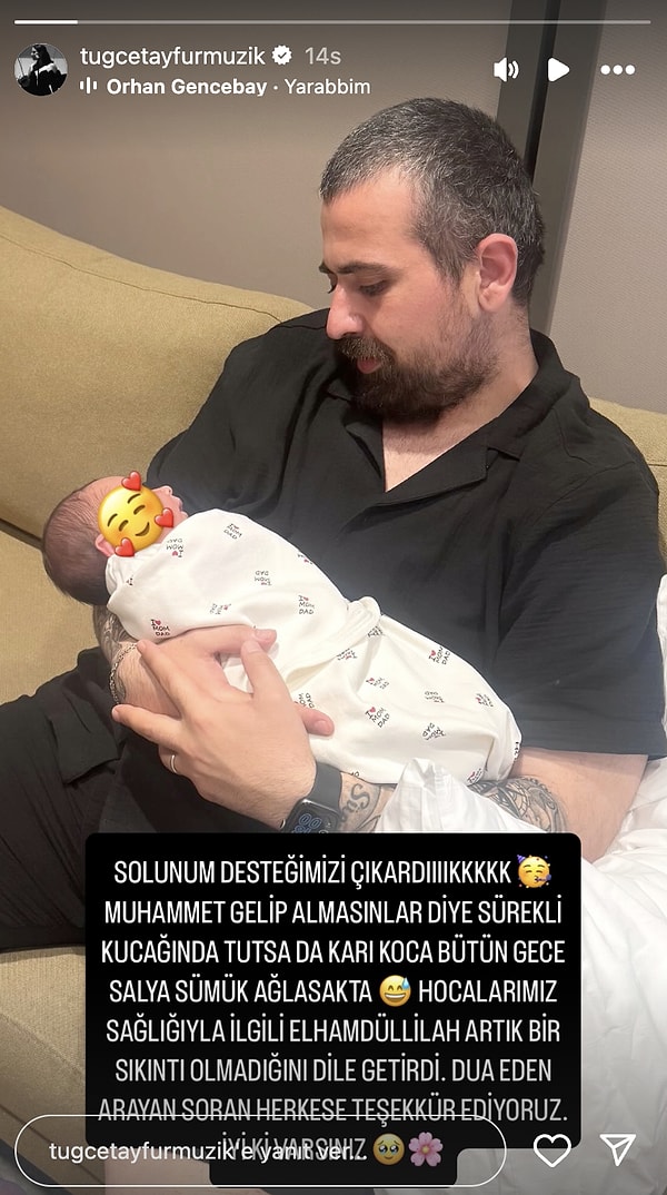 ‘Solunum takviyemizi çıkardık. Muhammet gelip almasınlar diye daima kucağında tutsa da karı-koca bütün gece salya sümük ağlasak da hocalarımız sıhhatiyle ilgili elhamdülillah artık bir düşünce olmadığını lisana getirdi. Dua eden, arayan, soran herkese teşekkür ediyoruz. Yeterli ki varsınız”