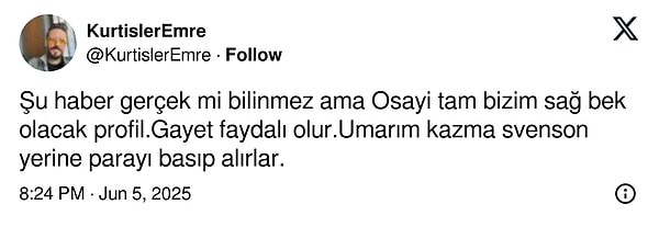 Haziran ayının sonunda Fenerbahçe ile kontratı bitecek olan Osayi Samuel’in yeni grubu Beşiktaş olabilir! Yağız Sabuncuoğlu’nun haberi sonrası siyah-beyazlı taraftarlar, toplumsal medyada Nijeryalı oyuncuya dair ‘kesin biz ilgileniyoruzdur’ yorumlarında bulundu. Alışılmış şu an için ne Fenerbahçe ne Osayi ne de Beşiktaş cephesinden resmi bir açıklama var.