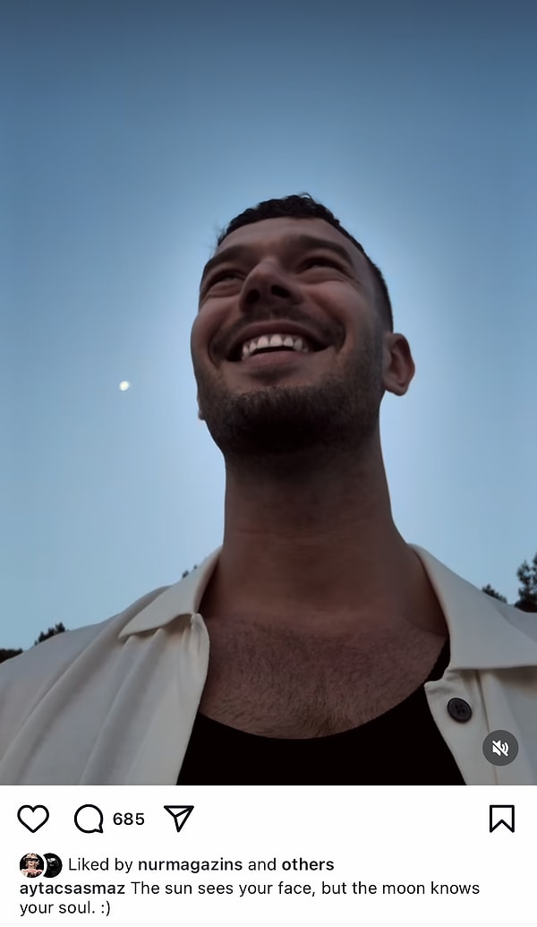 Hem ayı hem güneşi görebildiği bir açıya geçip görüntü çeken Aytaç Şaşmaz, paylaşımının altına, ‘The sun sees your face, but the moon knows your soul. :)’ yani, ‘Güneş yüzünü görür, fakat ay ruhunu bilir.’ notunu düştü, art fona da ‘Freedom’ isimli bir müzik koydu…