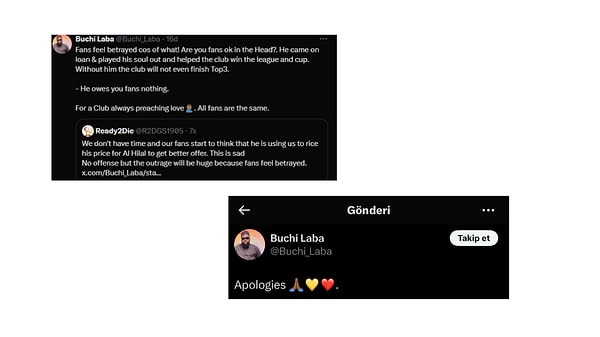 Victor Osimhen’in transferine dair belirsizlik sürerken, Nijeryalı golcünün yakın arkadaşı Buchi Laba’nın Galatasaray taraftarını gaye alan tabirleri toplumsal medyada geniş yankı uyandırdı. Laba, gelen yorumlar sonrası paylaşımını silip özür dilemek zorunda kaldı.