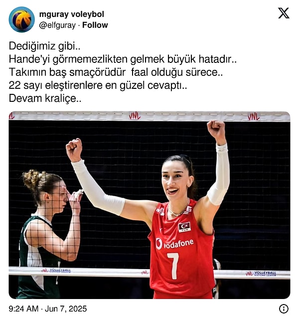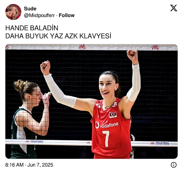 A Ulusal Bayan Voleybol Grubumuz, birinci haftası Çin’in mesken sahipliğinde düzenlenen Milletler Ligi’ndeki üçüncü maçından da galibiyetle ayrılırken takımımızda en dikkat çeken isim Hande Baladın oldu. Yeni dönemde Fenerbahçe forması giyecek olan 27 yaşındaki smaçörün gayreti, toplumsal medyada voleybol dünyasının gündemine oturdu.