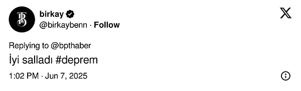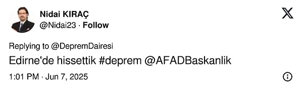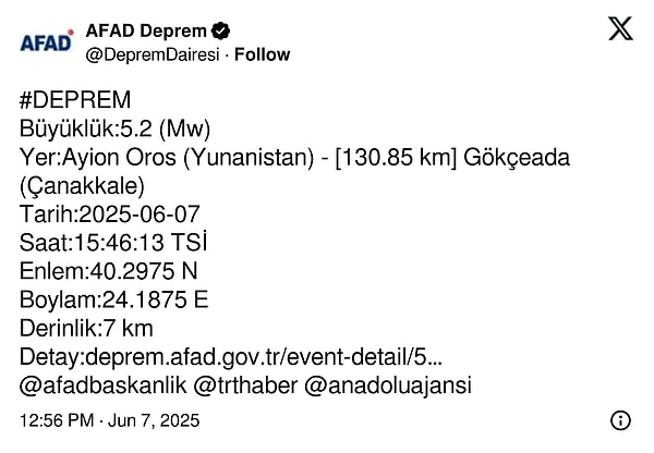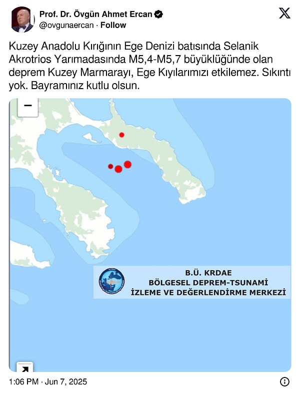 ‘Kuzey Anadolu Kırığının Ege Denizi batısında Selanik Akrotrios Yarımadasında M5,4-M5,7 büyüklüğünde olan sarsıntı Kuzey Marmarayı, Ege Kıyılarımızı etkilemez. Dert yok. Bayramınız kutlu olsun.’