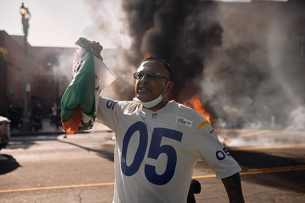 Los Angeles’taki federal binayı çevreleyen sokaklarda güvenlik güçleriyle yaşanan çatışmalar sırasında yere atılmış yanmış bir ABD bayrağı AFP objektifleri tarafından bu türlü görüntülendi. Bununla birlikte protestocuların California eyaletinin ayı figürlü bayrağını dalgalandırdığı görüldü.