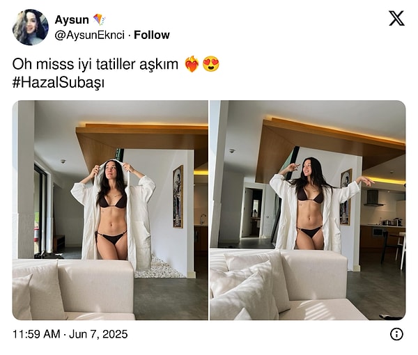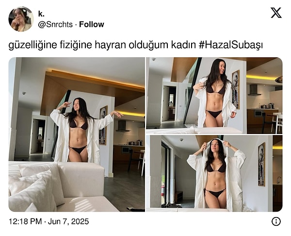 Şimdilerde Sahipsizler dizisinde canlandırdığı Azize karakteriyle isminden kelam ettiren genç oyuncu Hazal Subaşı, özel hayatıyla da magazincilerin radarında. Ünlü müzikçi Oğuzhan Koç ile aşk yaşayan Subaşı, bikinili paylaşımlarıyla adeta mest etti. Siyah bikinisiyle verdiği mert pozlara beğeni ve yorum yağdı. Fit bedeni ve etkileyici hoşluğu toplumsal medyada olay oldu.