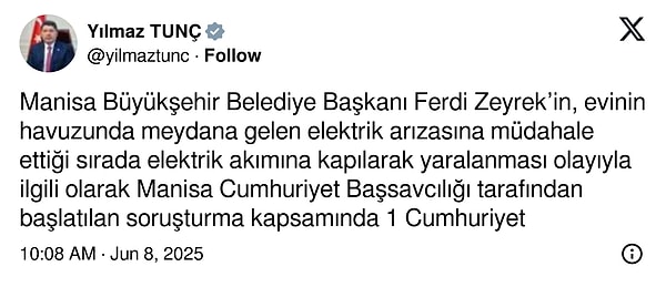 Manisa Büyükşehir Belediye Başkanı Ferdi Zeyrek’in elektrik akımına kapılması sonucu ağır yaralanmasının akabinde ağır bakımda tedavisi sürüyor. Zeyrek’in durumu hakkında Adalet Bakanı Yılmaz Tunç açıklama yaptı. Soruşturma kapsamında 1 Cumhuriyet Başsavcıvekili ile 2 Cumhuriyet Savcısı görevlendirildiğini belirten Tunç, “Havuzun elektrik tesisatında ve muhafaza sistemlerinde elektrik kaçağına yol açan teknik arızaların bulunduğu tespit edilmiştir” dedi.