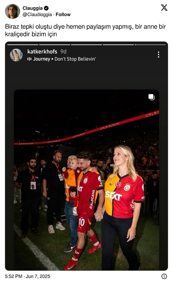 Dries Mertens’in “oğlumun önceliği Napoli” açıklaması, Galatasaray taraftarının reaksiyonunu çekmişti. Yaşananların akabinde yıldız futbolcunun eşi Katrin Kerkhofs devreye girdi. Kerkhofs, Instagram hesabından küçük Ciro’nun şampiyonluk kutlamalarında Galatasaray forması giydiği bir fotoğrafı paylaşarak adeta “Benim oğlum Galatasaraylı” dedi.