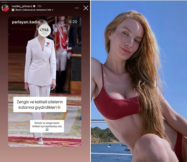 ‘Zengin ve kaliteli ailelerin kızlarına giydirdikleri’ notu düşülen bir görüntüyü öyküsüne ekleyen Nasibe Yılmaz’ın gelini Buyruğa Cansu Kurtaran’a gönderme yaptığı düşünüldü. O paylaşımın çabucak akabinde Reynmen’in eşi Nasibe Yılmaz’ın gelini Emire’den bikinili bir paylaşım geldi.
