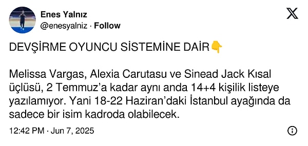 Melissa Vargas, Alexia Carutasu ve Sinead Jack Kısal üçlüsü, 2 Temmuz’a kadar tıpkı anda 14+4 kişilik listeye yazılamıyor. Yani 18-22 Haziran’daki İstanbul ayağında da yalnızca bir isim takımda olabilecek.