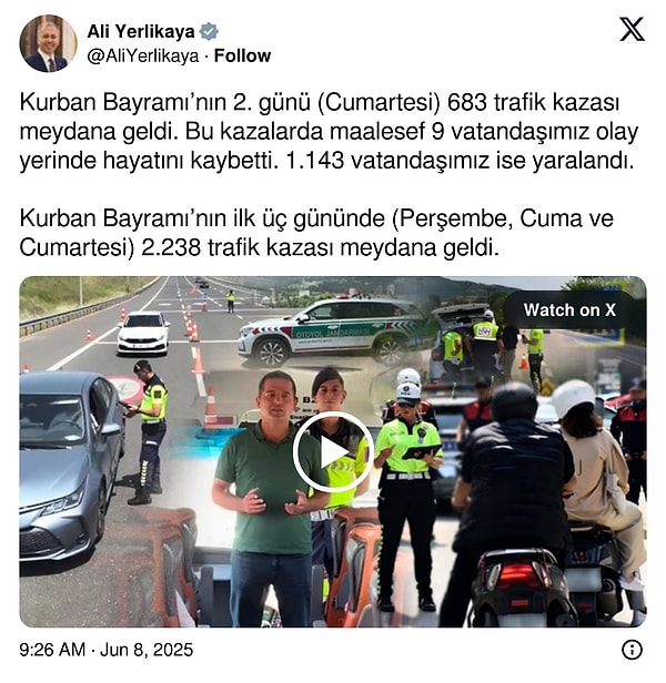 Ali Yerlikaya, Kurban Bayramı’nın 2. günü kaza bilançosunu açıkladı. Bayramın ikinci gününde 683 kaza meydana geldi. Kazalarda 9 kişi hayatını yitirdi, 1143 kişi yaralandı.