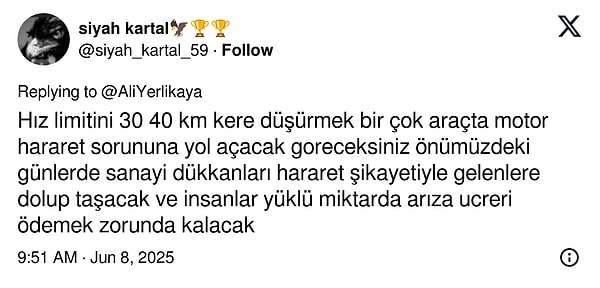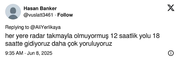 Trafik kazalarının azaltılması maksadıyla Kurban Bayramı’nda radar uygulaması devreye sokuldu. Radar uygulamasıyla otoyollarda apansız düşen sürat limitleri ve radarlarla trafik cezalarıyla karşı karşıya kalan vatandaşlar isyan etti. İçişleri Bakanı Ali Yerlikaya, Kurban Bayramı’nın birinci üç gününde kaza bilançosunu açıkladı. Yerlikaya’nın paylaşımı kullanıcıları ikiye böldü.