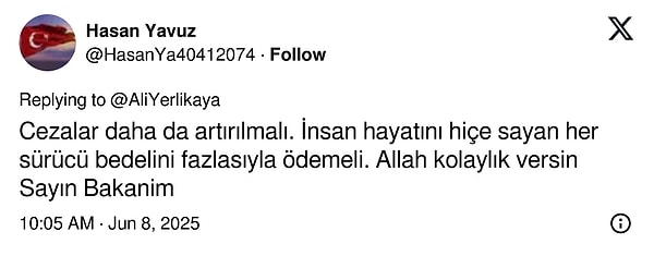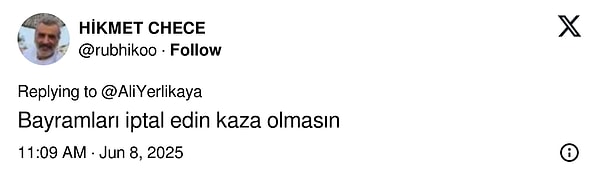 Denetlemelerimiz süreç yapmak için değil, kazaları önlemek ve can kaybımızı sıfıra indirmek içindir. Trafik kurallarına uyalım, bayram sevincimize hüzün karışmasın. Hayatını kaybeden vatandaşlarımıza Allah’tan rahmet, yaralılarımıza acil şifalar diliyorum.