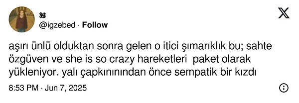 3 dönem boyunca Star TV’de ekrana gelen Yalı Çapkını dizisi, 101. kısmıyla veda etmişti. Finali büyük tartışma yaratan dizinin başrol oyuncusu Afra Saraçoğlu, diziyle birlikte yıldızını parlatan isimlerden biri oldu. Şimdilerde ekranlara orta veren Saraçoğlu, tatilin keyfini çıkarıyor. Son olarak annesiyle yaptığı otomobil seyahatini paylaştı. Lakin çektiği görüntü toplumsal medyada olay oldu. Kimi kullanıcılar paylaşımı itici bulurken, bazıları de “kıskanıyorsunuz” diyerek ünlü oyuncuya sahip çıktı.
