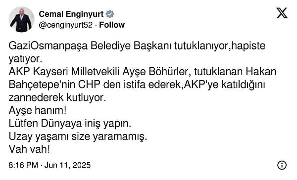 İstanbul’un Avrupa Yakası’ndaki ilçelerinden Gaziosmanpaşa 2024 yerel seçimlerinde sürpriz bir halde CHP’ye geçmişti. Hakan Bahçetepe AKP’nin kalelerinden biri olarak kabul edilen Gaziosmanpaşa’yı kazanmıştı. Bahçetepe’nin tutuklanmasının akabinde meclis çoğunluğuyla belediye AKP’ye geçti. Lakin AKP Kayseri Milletvekili Ayşe Böhürler durumu yanlış anladı.