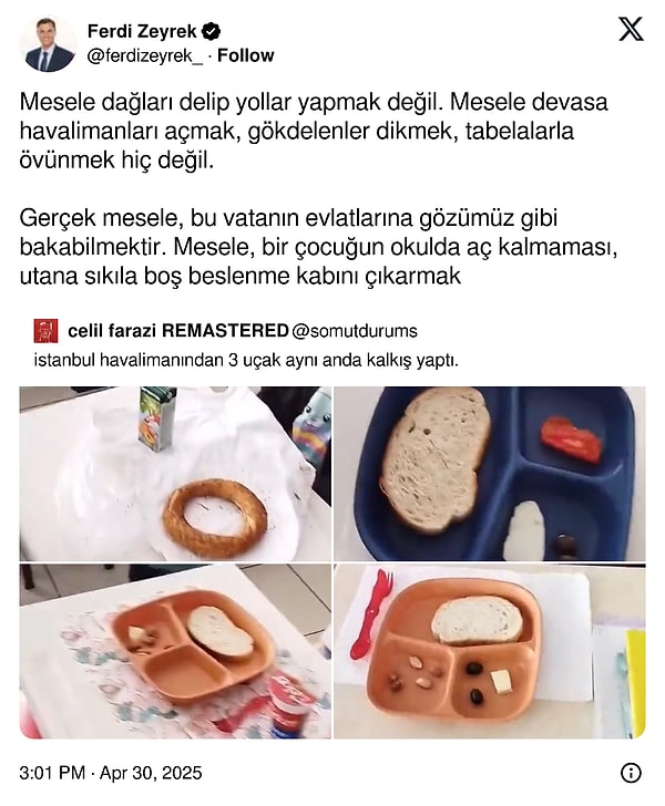 Öğrencilerin neredeyse boş olan beslenme çantalarının fotoğraflarını alıntılayarak günümüz ekonomik durumunu eleştirmişti. Zeyrek gönderisinde şu sözlere yer vermişti: