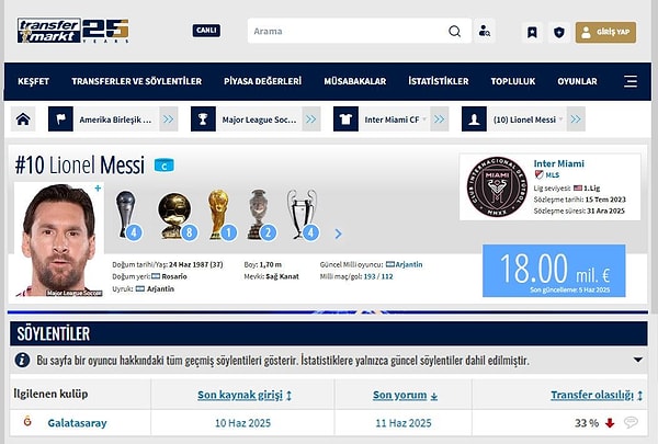 ‘Messi Galatasaray’a mı gelecek?’ sorusuna şu an için net bir karşılık vermek mümkün değil. Transfermarkt’ın aktardığına nazaran Messi’nin Galatasaray’a transfer olma mümkünlüğü %33. Ancak durumun söylentiden ibaret olduğunu da söz etmek gerek.