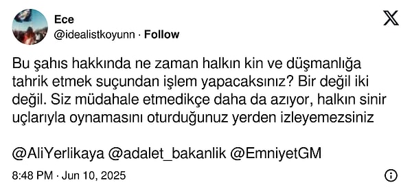 Bu şahıs hakkında ne vakit halkın kin ve düşmanlığa tahrik etmek kabahatinden süreç yapacaksınız? Bir değil iki değil. Siz müdahale etmedikçe daha da azıyor, halkın hudut uçlarıyla oynamasını oturduğunuz yerden izleyemezsiniz