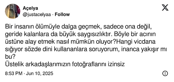Bir insanın vefatıyla dalga geçmek, yalnızca ona değil, geride kalanlara da büyük saygısızlıktır. Bu türlü bir acının üstüne alay etmek nasıl mümkün oluyor?Hangi vicdana sığıyor kelamda dini kullananlara soruyorum, inanca yakışır mı bu?